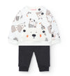 The whimsical top is filled with friendly forest animals while charcoal joggers feature a fuzzy bear face patch on the butt. A playful mix that little ones will love.