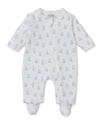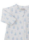 A sweet everyday essential with boutique softness. This cozy jacquard footie is covered in tiny blue teddy bears and finished with a gentle quilted texture that feels extra plush against baby’s skin. The asymmetrical zipper makes late-night changes quick and quiet, while the built-in feet keep little toes warm from stroller to bedtime. A classic baby-blue piece that always photographs beautifully and makes an easy gift for new arrivals.