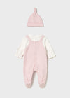 This adorable 2-piece set combines sweetness and comfort for your little one. The white long-sleeve blouse features subtle polka dots and gathered cuffs, perfectly layered under soft pink overalls with a front pocket detail. A matching pink knot-top hat completes the look for a picture-perfect finish.