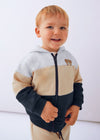 • Teddy Trail Set: Colorblock zip-up hoodie in cream, beige, and navy with an adorable teddy bear patch — paired with soft beige jogger pants featuring elastic cuffs and waistband.