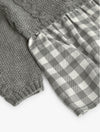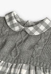 A sweet layered-look dress combining a soft grey knit sweater top with cable detail and a crisp gingham skirt and collar. Classic and comfortable with timeless charm.