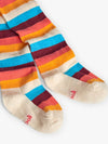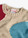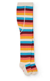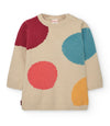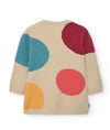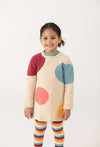A playful sweater dress covered in oversized colorful polka dots is paired with rainbow striped tights for maximum fun. Soft knit keeps the look cozy yet bright.