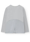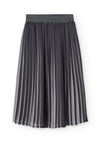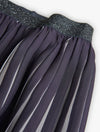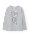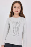 Soft grey long-sleeve top with a sketched ballet slipper design pairs with a metallic pleated skirt. An outfit that balances comfort with sparkle.
