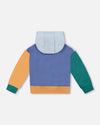Top: A soft pullover hoodie with a mix of rich blue, light blue, orange, and green sleeves, plus a roomy kangaroo pocket for extra fun.