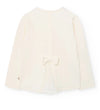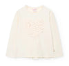 A chic pairing that balances sweetness with a touch of shine. The ivory long-sleeve top features delicate 3D floral appliqués in the shape of a heart on the front and a bow detail at the back for extra charm. It’s paired with metallic brown pants that bring a modern, fashion-forward twist to the look.