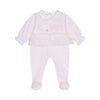 - Two-piece set includes a soft pink footie with delicate ruffle details and a matching heart-shaped bib