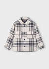 - Plaid flannel overshirt in blue and grey hues with button-down front and chest pockets