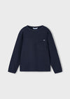 - Ribbed navy blue long sleeve tee with chest pocket and woven label detail
