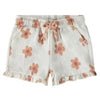 - Cream-colored floral print shorts with ruffle hem for extra charm