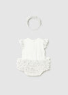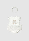 Mayoral Baby Teddy Motif Tulle Romper with Headband Cream