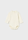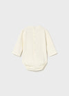 - Ivory long-sleeve bodysuit with snaps at the back and bottom for quick changes