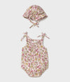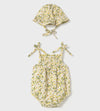 A delightful and breezy outfit, perfect for sunny days and outdoor adventures. This two-piece set includes a charming romper and matching bonnet, designed for comfort and style.